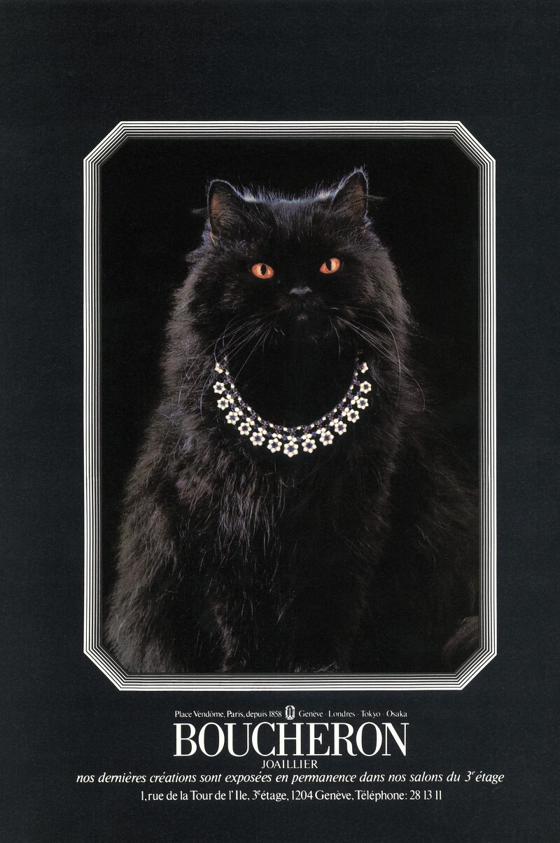 在 Boucheron 的品牌历史里有这么一个故事。据说第三代家族成员Gérard 于1970年代领养了一只黑色长毛猫咪 Wladimir,时常巴黎芳登广场总店,个性温驯亲人当然广受贵客宠爱,80年代牠跃身镜头前穿戴珠宝拍摄广告片,留下的影像至今仍蔚为经典,并持续带来创意启蒙。