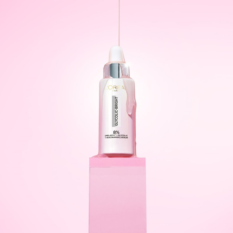 巴黎莱雅净亮白MELA淡斑精华情境图。 关键成份之一能从肌肤深层阻断黑色素生成,并帮助淡化瑕疵、长年痘斑或是顽固黑斑。另一个则是甘醇酸,深入角质层加速焕肤效果及肌肤代谢週期,使全脸肌肤细緻焕白。